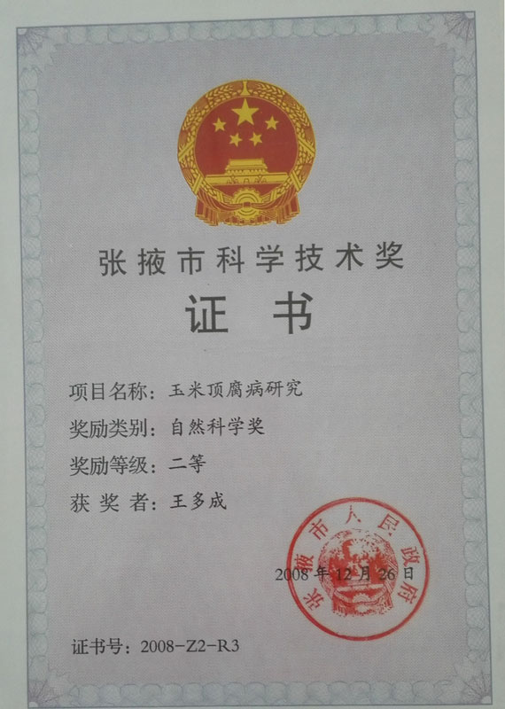 2008年榮獲張掖市科學技術二等獎證書