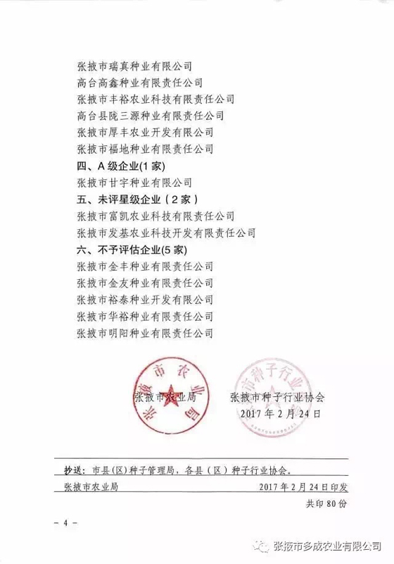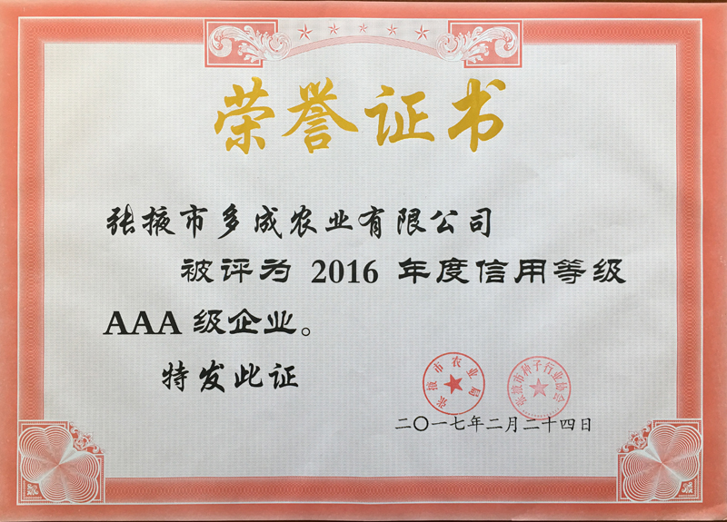 | 熱烈祝賀張掖市多成農(nóng)業(yè)有限公司被評(píng)為2017年度信用等級(jí)AAA級(jí)企業(yè)!! | ||
