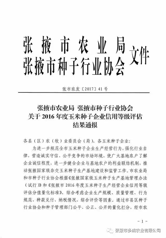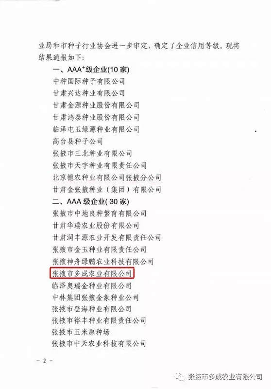 熱烈祝賀張掖市多成農(nóng)業(yè)有限公司被評(píng)為2017年度信用等級(jí)AAA級(jí)企業(yè)! 2017年2月24日,張掖市農(nóng)業(yè)局、張掖市種子行業(yè)協(xié)會(huì)公布的《2016年度玉米種子企業(yè)信用等級(jí)評(píng)估結(jié)果》中,張掖市多成農(nóng)業(yè)有限公司被評(píng)為2016年度信用等級(jí)AAA級(jí)企業(yè)。 |